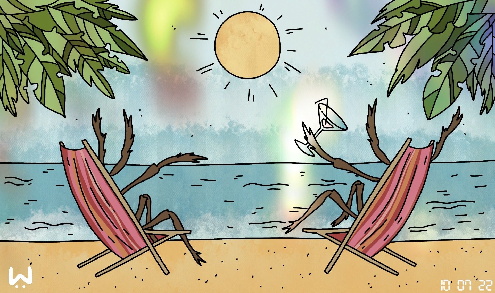 +27 в тени. Передо мной форсируют берег огромный сыр и не менее внушительный болгарский перец. У одного сверху синтетического костюма видна подростковая голова, второй затылок прячется в зелёном стебле и разговаривает через сетку. Вместе они подходят к отдыхающим, чтобы протянуть листовку с рекламой пиццерии. Вокруг шезлонгов стоят рядами бутылки — гастрономический выбор целевой аудитории очевиден.