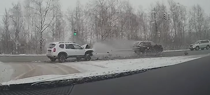 Чёрный джип пытался пролететь на мигающий зелёный и врезался в "Рено". От удара внедорожник вынесло на встречку, там он зацепил ещё один автомобиль.