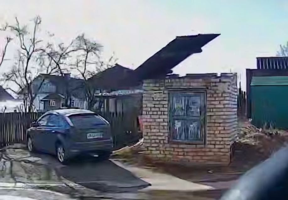Ветер снёс крышу кирпичной будки на припаркованную иномарку в Семёнове.