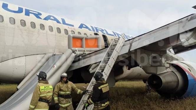 На кадрах — Airbus после аварийной посадки в поле и испуганные пассажиры, ожидающие, когда за ним приедут в автобусы. На месте работают экстренные службы.