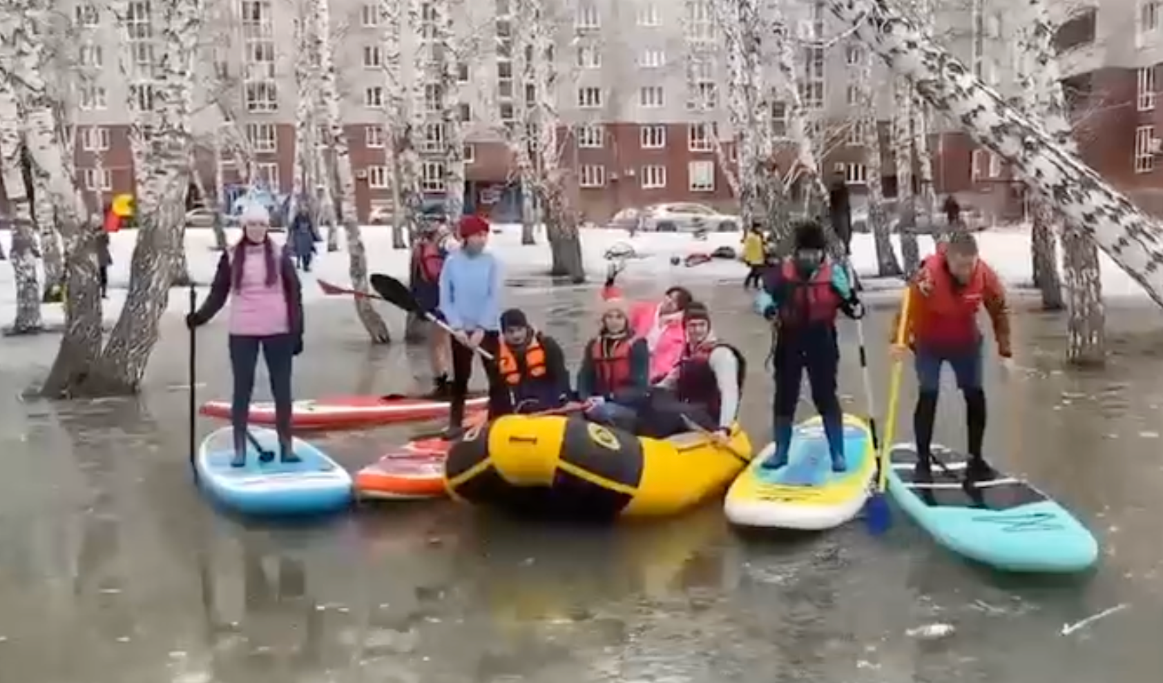 Омичи устроили заплыв на сапах по двору, в котором собирается огромная лужа.