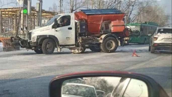 Снегоуборочная машина попала в аварию и собрала пробку в Новосибирске.