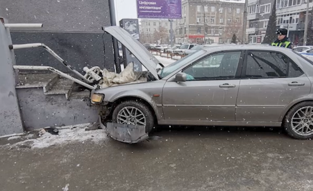 Водитель чуть не снёс трёх человек в Новосибирске и врезался в магазин.