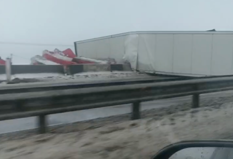 После ДТП водитель остался жив, но машину развернуло — прицеп встал аккурат поперёк проезжей части. Возле Глубокого уже собралась 7-километровая пробка. Пока тягачи не приехали на место, люди пытаются как-то объехать большегруз по обочине.