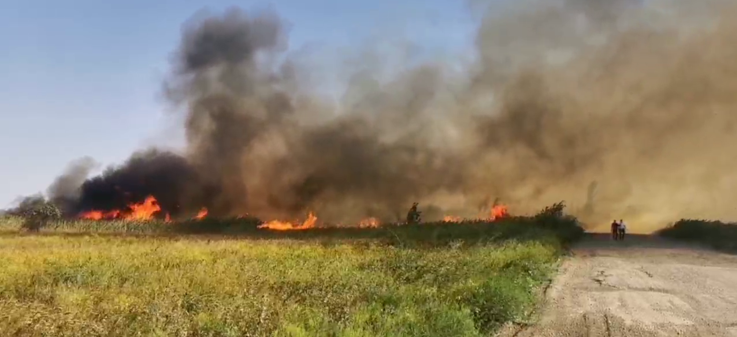 Первое сообщение о возгорании камыша поступило в 14:25. За это время пламя сильно распространилось — тушить его становится всё сложнее.