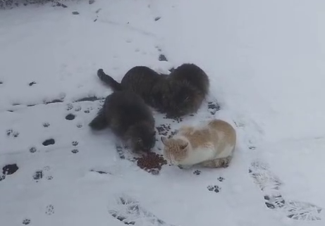 Пушистые мурлыки таинственным образом появились у верхней станции канатки не так давно. Котики успели подрасти, но забегаловки позакрывались. Люди ушли, оставив подопечных на волю судьбы: на лютом холоде, в снегу и тумане. Им нечего есть и пить.