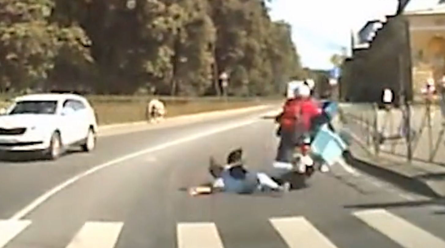 Момент самого ДТП попал на видеорегистратор случайной машины — на кадрах видно, как пострадавшая с другими пешеходами пытается быстро пересечь дорогу на запрещающий сигнал. Но водитель мотика в этот момент, видимо, тоже куда-то спешил. И в итоге сбил женщину.