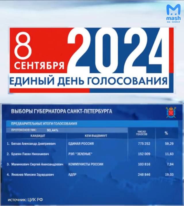 С результатом 59,29% на выборах губернатора Петербурга лидирует Александр Беглов — на данный момент обработано уже 90,44%.