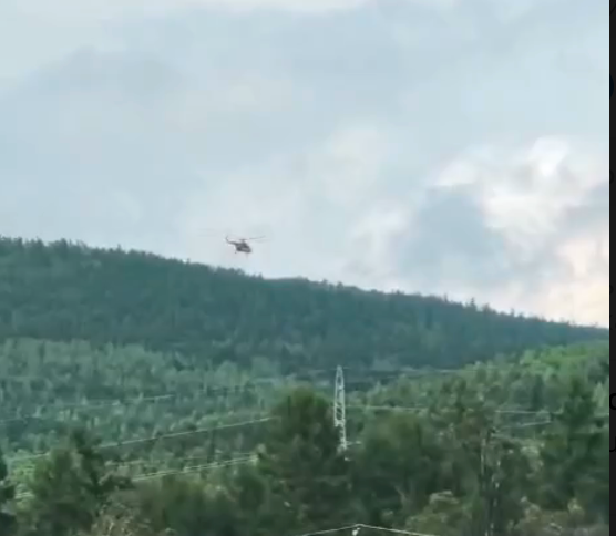 Кадры поисковой операции разбившегося Ан-24 с борта вертолёта. Видны обломки фюзеляжа самолёта в огне.