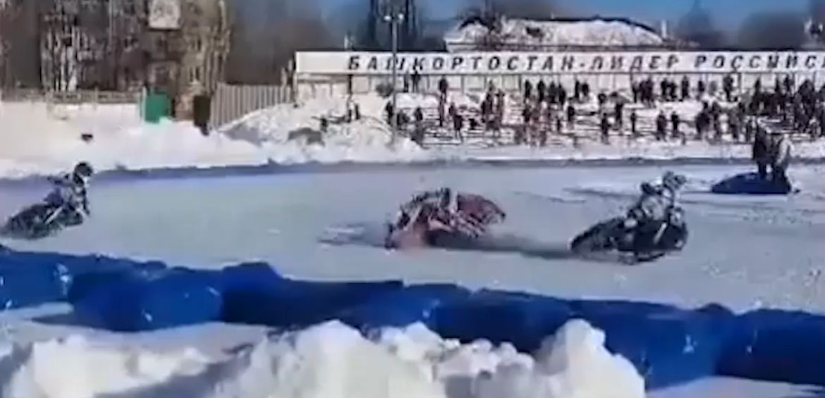 Жёсткие кадры с мотогонок на льду в Уфе: под колёса соперника упал участник из Курганской области.
