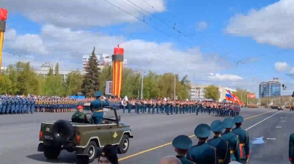 Самый зрелищный праздник года идёт полным ходом. Военные Башкирии ровным строем маршируют по проспекту Октября под звуки оркестра.