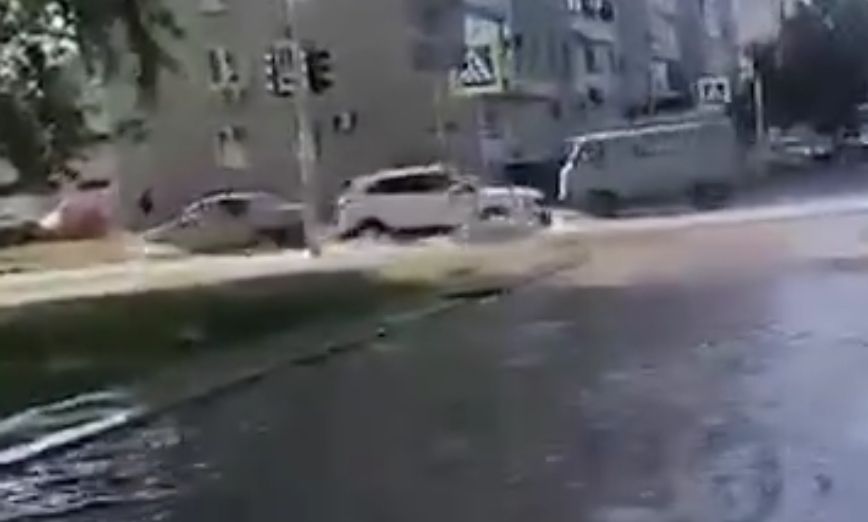 Дорога на улице Ухтомского в считаные минуты превратилась в реку. На месте работают коммунальщики. Они сказали, что всё это — гидравлическое испытание и процесс идёт по плану.