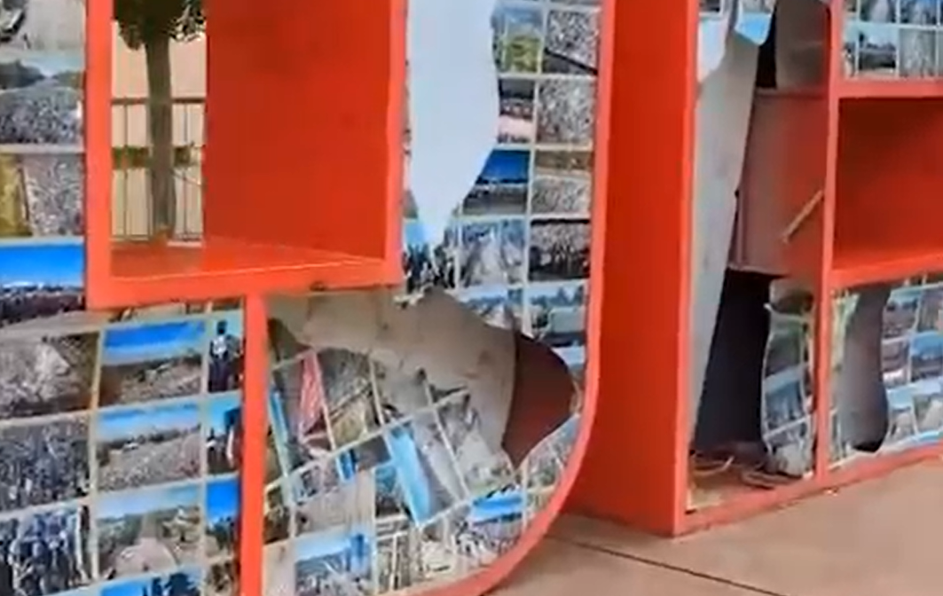 Композиция из букв ПОБЕДА с фотографиями майских парадов разных лет стоит в сквере Юнармейцев. Сейчас выглядит вот так. Видео снял местный общественник.