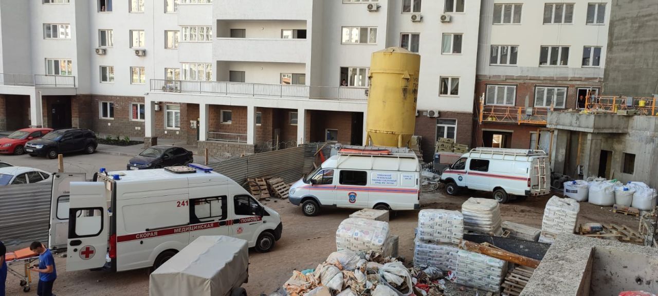 Платформа с рабочими упала с седьмого этажа на Менделеева — погибло два человека, ещё двоих забрала скорая в тяжёлом состоянии.