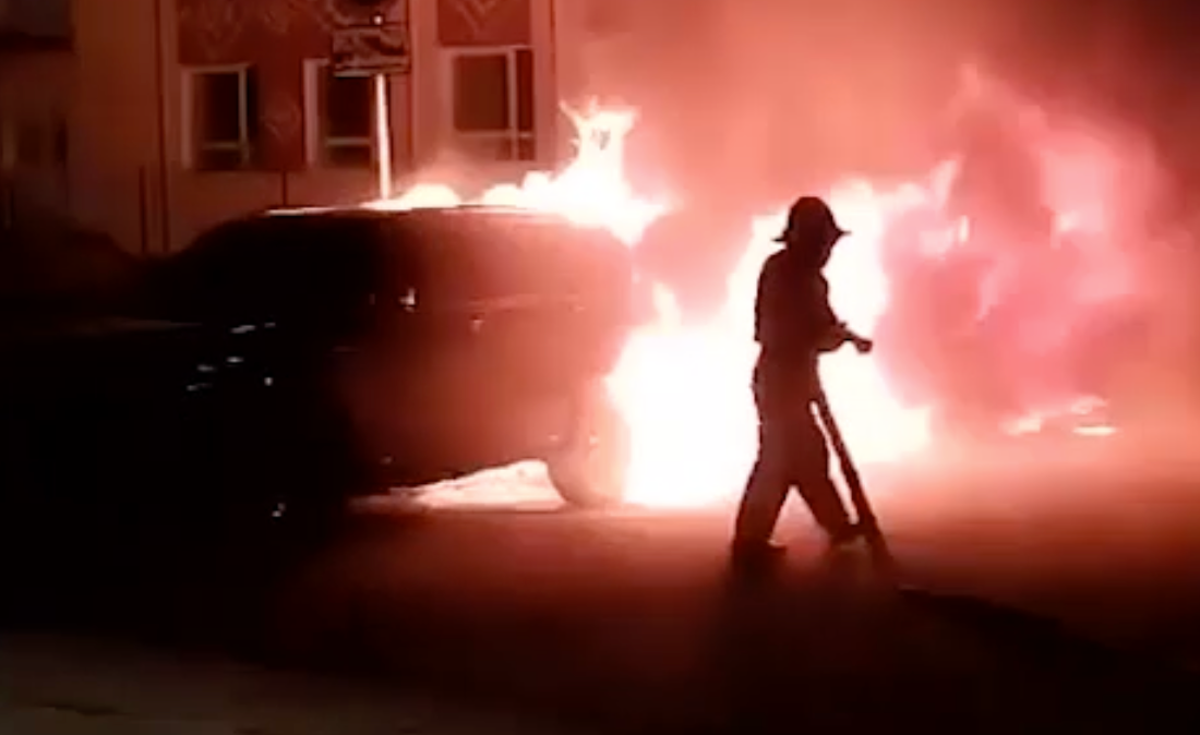 Этой ночью неизвестный облил "Ниссан Мурано" жидкостью из канистры, и через мгновенье авто загорелось. Огонь перекинулся на соседний "Чанган CS95". Жители двора проснулись от взрывов и вызвали пожарных. Из людей никто не пострадал.